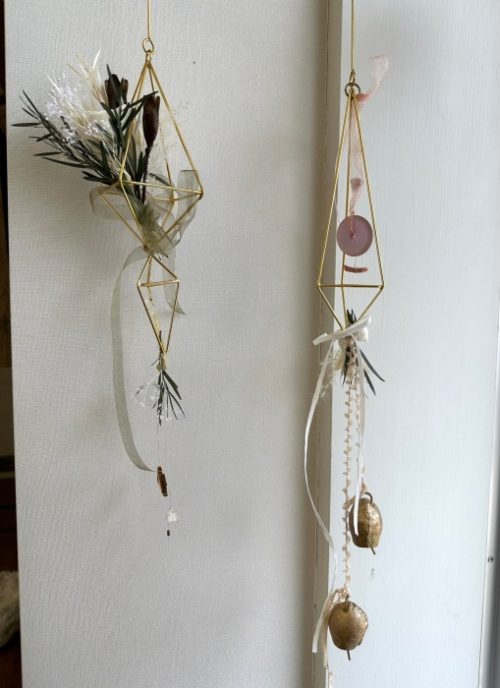 右側のベルと花を一緒にしていたり、ガラスの使い方が面白いですね。目に止まります。