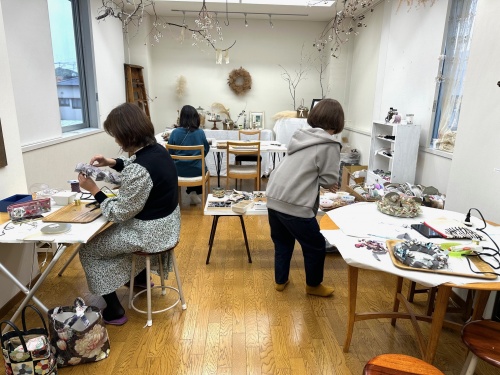 ふんわりと上手くまとめていますよね。異素材のリボンの組み合わせをモノトーンにしたことでキレイにまとまりました。紫の色の入り方や黒レースの分量、お見事です。
