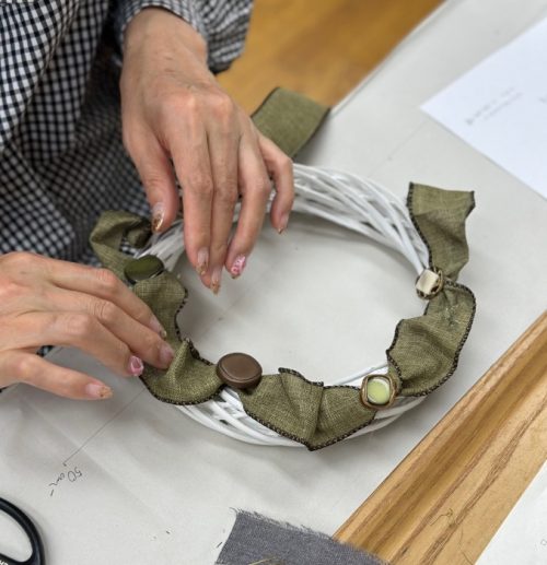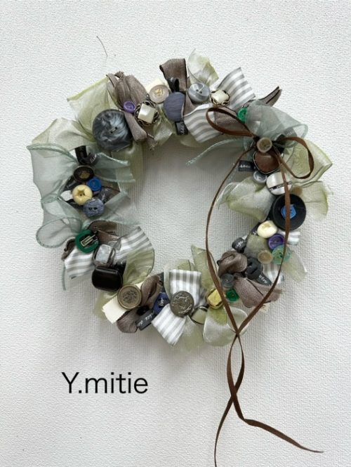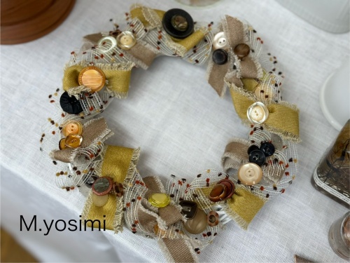 とっても大人っぽい作品。良くみると布花も入っています。細いリボンでボタンをたくさん通したり、リボンやボタンがオシャレです。