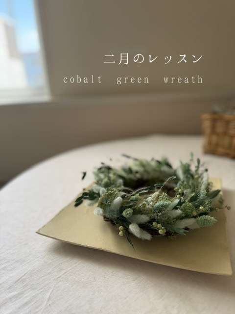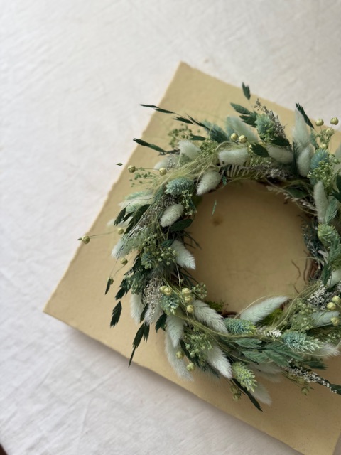 ブルー系のグリーンの濃淡のグラデーションがキレイなリースです。